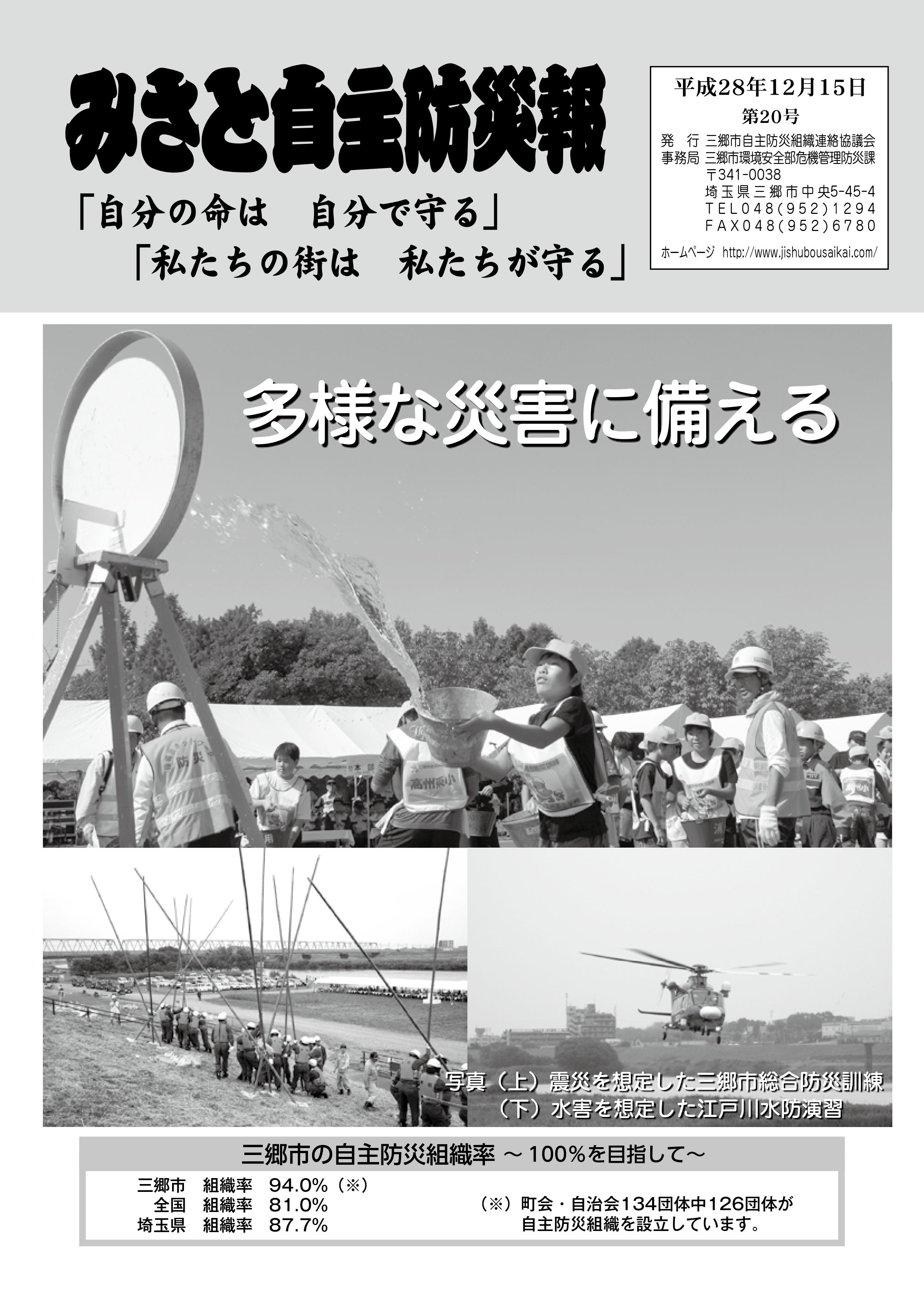 自主防災報 第28号(2024/12/13発行) 第27号(2023/12/15発行) 第26号 (2022/12/15 発行) 第25号 (2021/12/15 発行) 第24号 (2020/12/14 発行) 第23号 (2019/12/13 発行) 第22号 (2018/12/14 発行) 第21号 (2017/12/15 発行) 第20号 (2016/12/15 発行) 第19号 (2015/12/15 発行) 第18号 (2014/12/15 発行) 第17号 (2013/12/13 発行) 第16号 (2012/12/14 発行) 第15号 (2011/12/15 発行) 第14号 (2010/12/15 発行) 第13号 (2009/12/15 発行) 第12号 (2008/12/15 発行) 第11号 (2007/12/15 発行) 第10号 (2006/12/15 発行) 第9号 (2005/12/15 発行 第8号 (2004/12/15 発行) 第7号 (2003/12/15 発行) 第6号 (2002/12/14 発行) 第5号 (2001/12/14 発行) 第4号 (2000/12/15 発行) 第3号 (1999/12/15 発行) 第2号 (1998/12/15 発行) 第1号 (1997/12/15 発行) リーフレット 在宅避難のススメ 災害の備えチェックリスト等